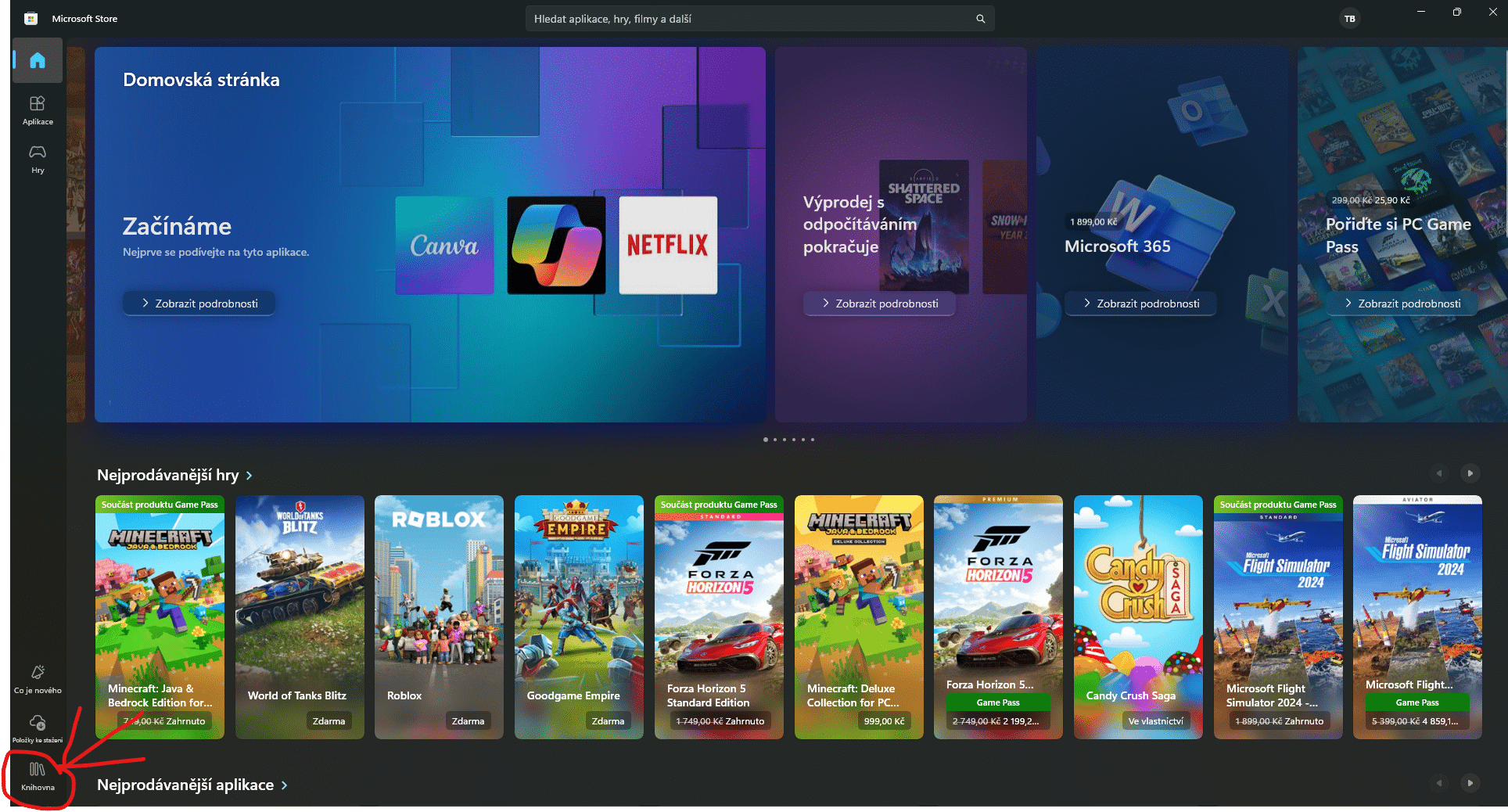 Otevřete nyní aplikaci Microsoft Store ve svém PC z bodu 1. a Klikněte dole vlevo v aplikaci na "knihovna"