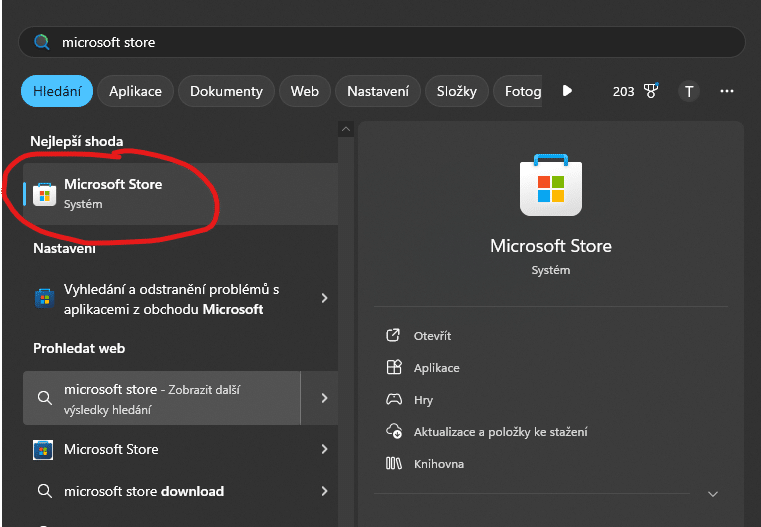 Klikněte na start v dolní liště na PC a napište do vyhledávání "Microsoft Store" a aplikaci otevřete.